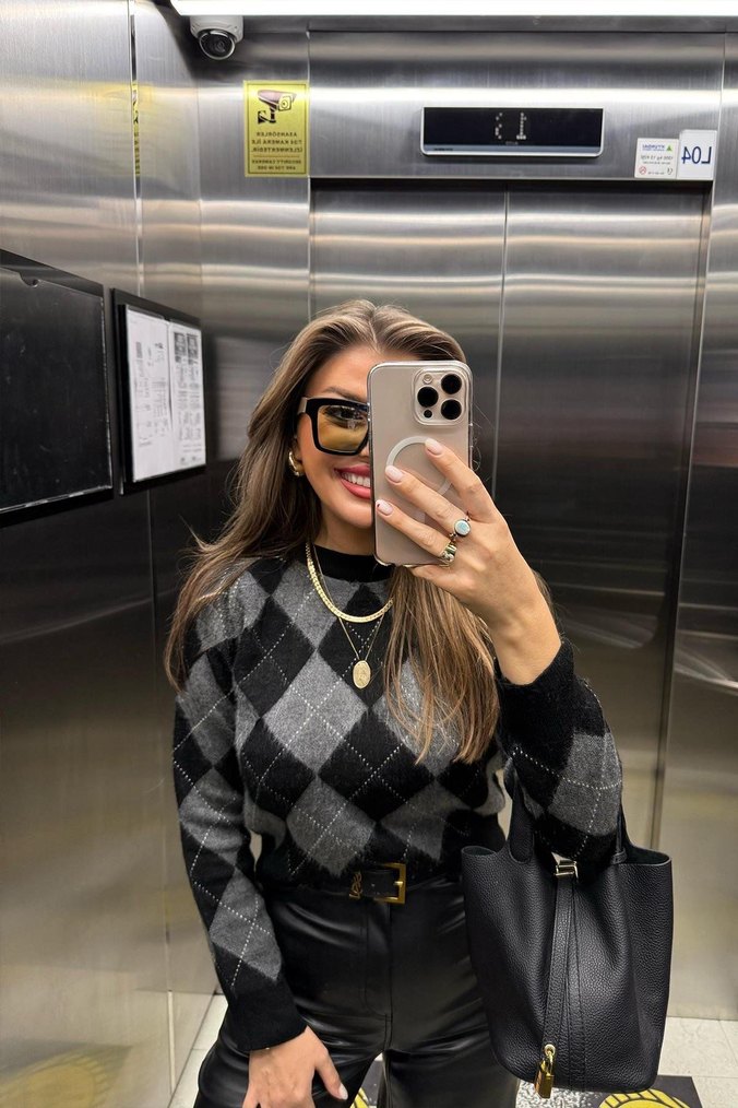 Gri kareli desen ve parlak deri dokusuna sahip, uzun kollu, yuvarlak yaka, bol kesim kadın kazak. Günlük kullanıma uygun, sokak tarzını yansıtır.