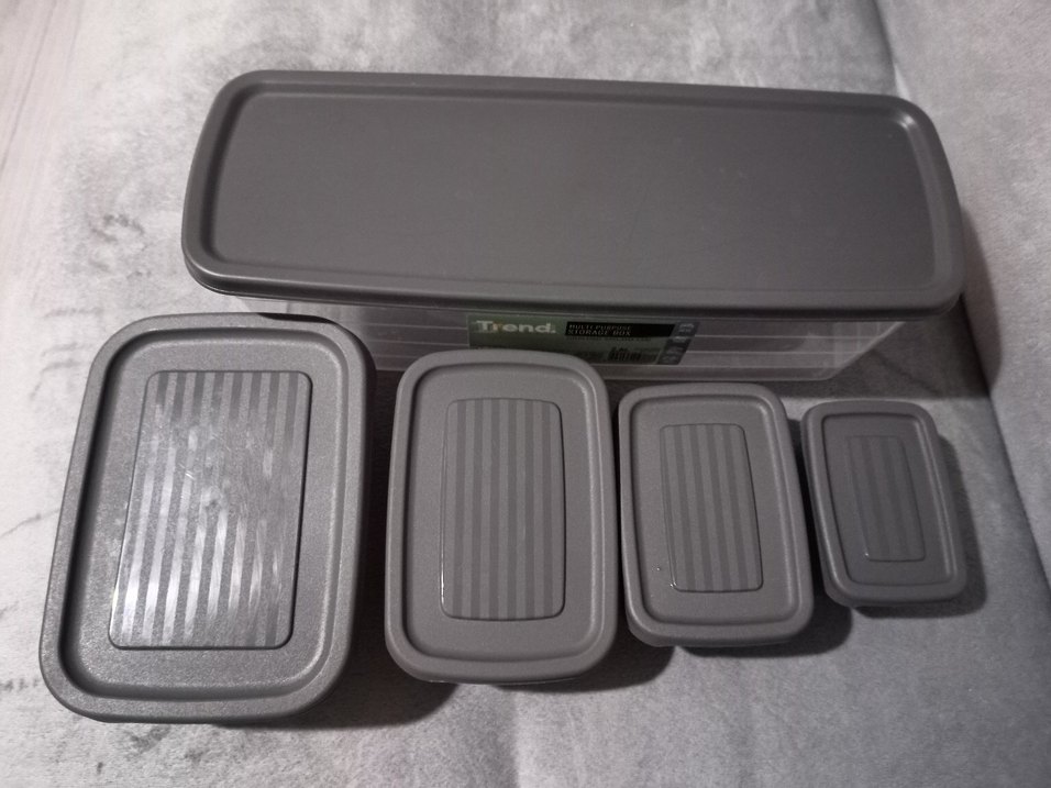 Gri renkli, kapaklı plastik saklama kapları seti, mutfakta kullanıma uygun sade ve fonksiyonel tasarım.
