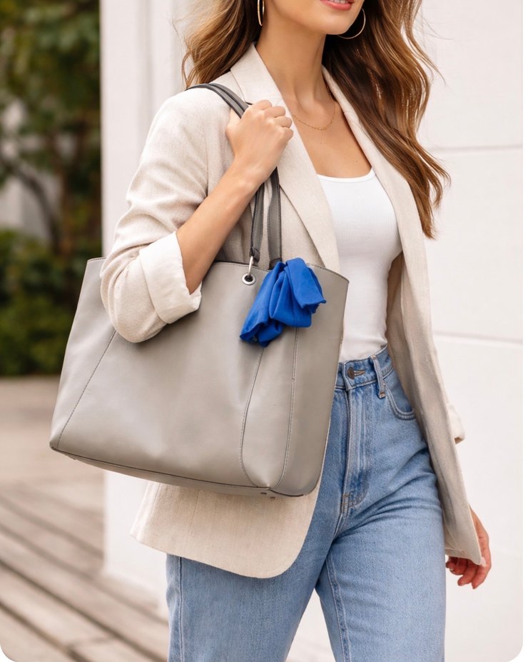 Gri büyük boy, içi ve fuları saks mavisi çok şık ve kullanışlı bir çanta ✨ #çanta #tasarım #fular #saksmavisi #büyükçanta
