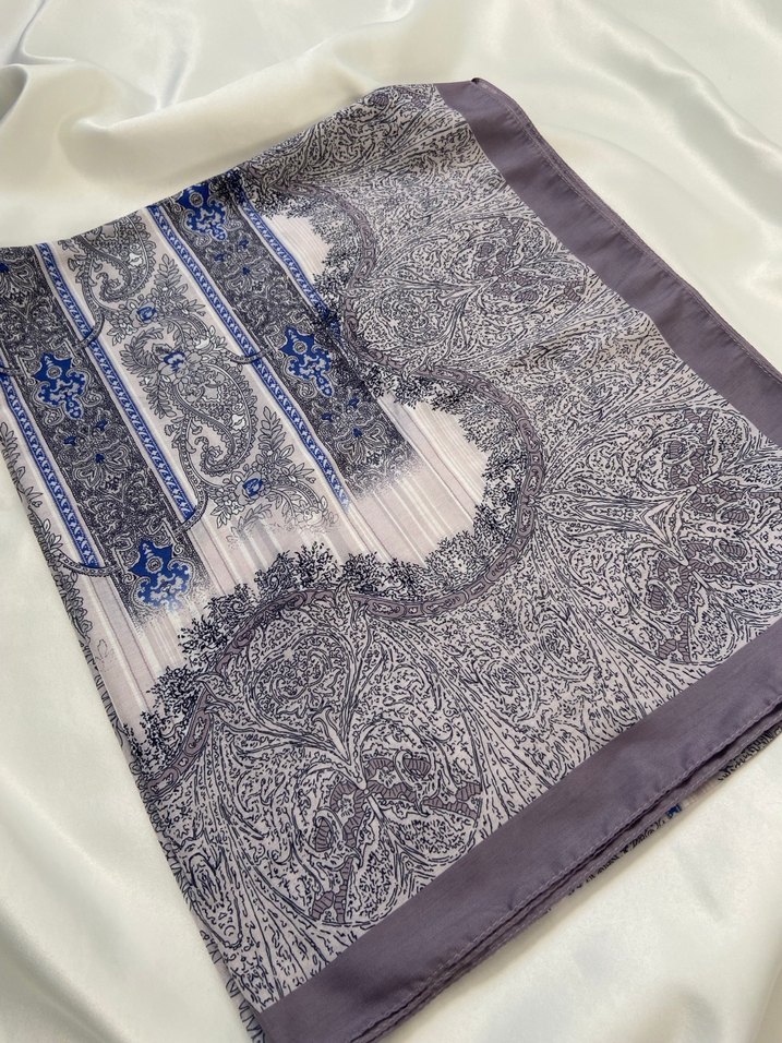 Gri renkte, ipek dokulu, drapeli tasarıma sahip kadın şalı, bohem desenlerle sade ve şık bir görünüm sunar.