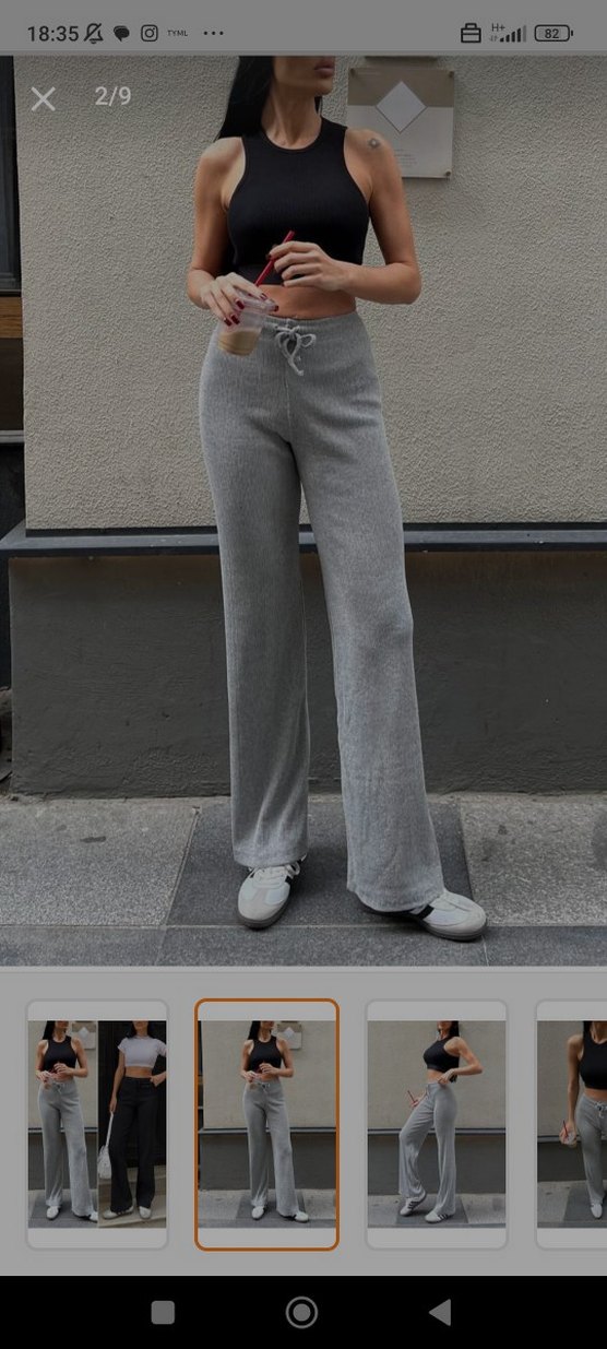 Yumuşak sentetik kumaştan yapılmış, salaş kesim gri ispanyol paça pantolon, günlük rahat kullanım için şık sokak stiliyle uygun.