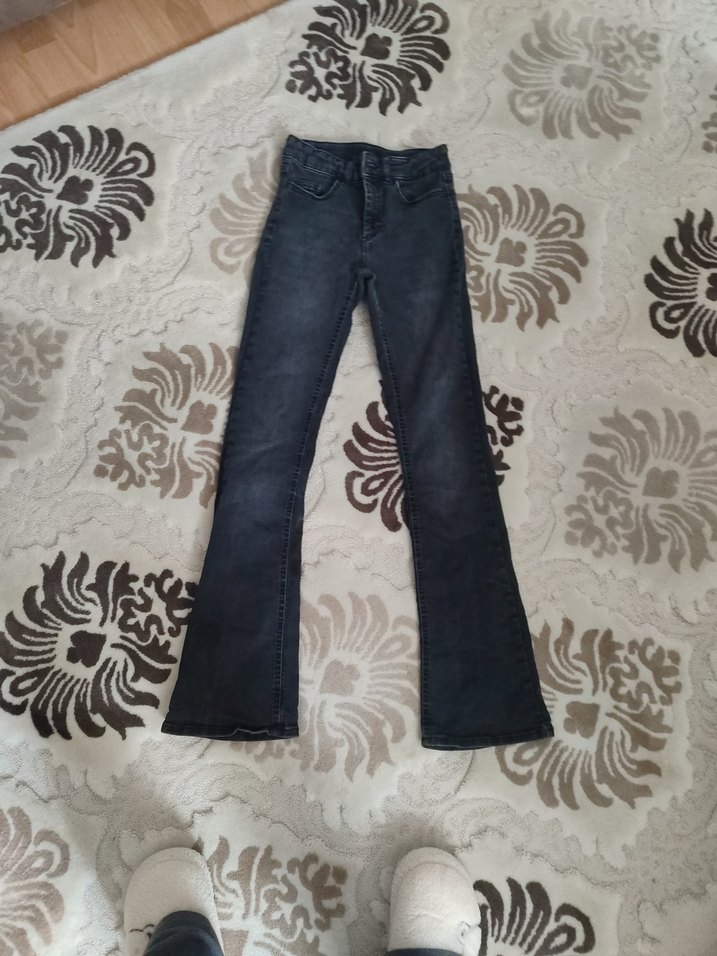 Gri renkli, salaş kesime sahip kot pantolon. Normal boyda, rahat midi tarzıyla günlük kullanıma uygundur. İspanyol paça