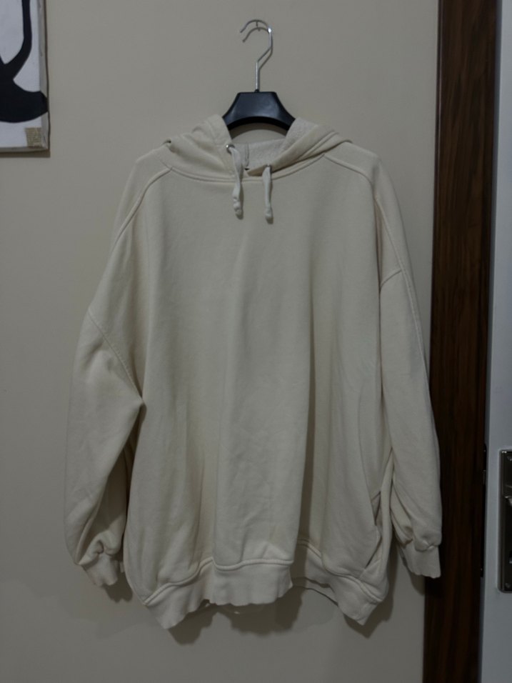 Gri renkte, uzun kollu, yuvarlak yaka ve kapüşonlu salaş kesim kadın sweatshirt. Keten kumaştan, günlük kullanım için sade ve şık bir tasarım.
