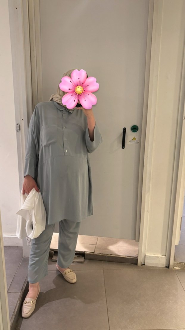 Yumuşak keten kumaştan, uzun kollu ve yüksek yakalı gri salaş kadın takım elbise, günlük kullanım için rahat ve zahmetsiz şıklık sunar.