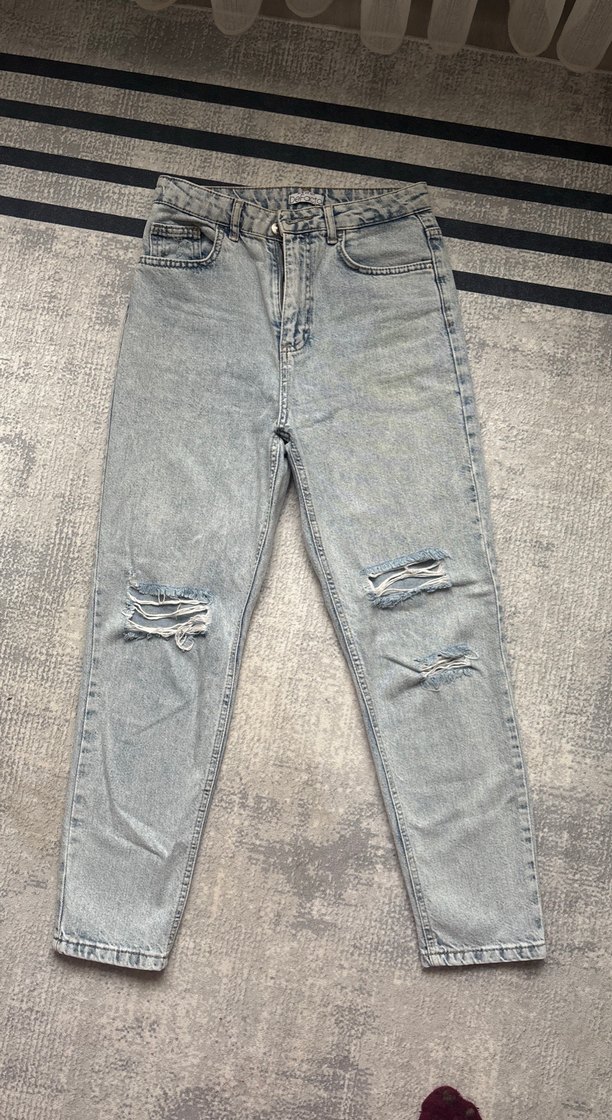Gri renk salaş kesim, normal boy, yırtık detaylı kadın denim jean. Günlük sokak stiline uygun rahat bir tasarım