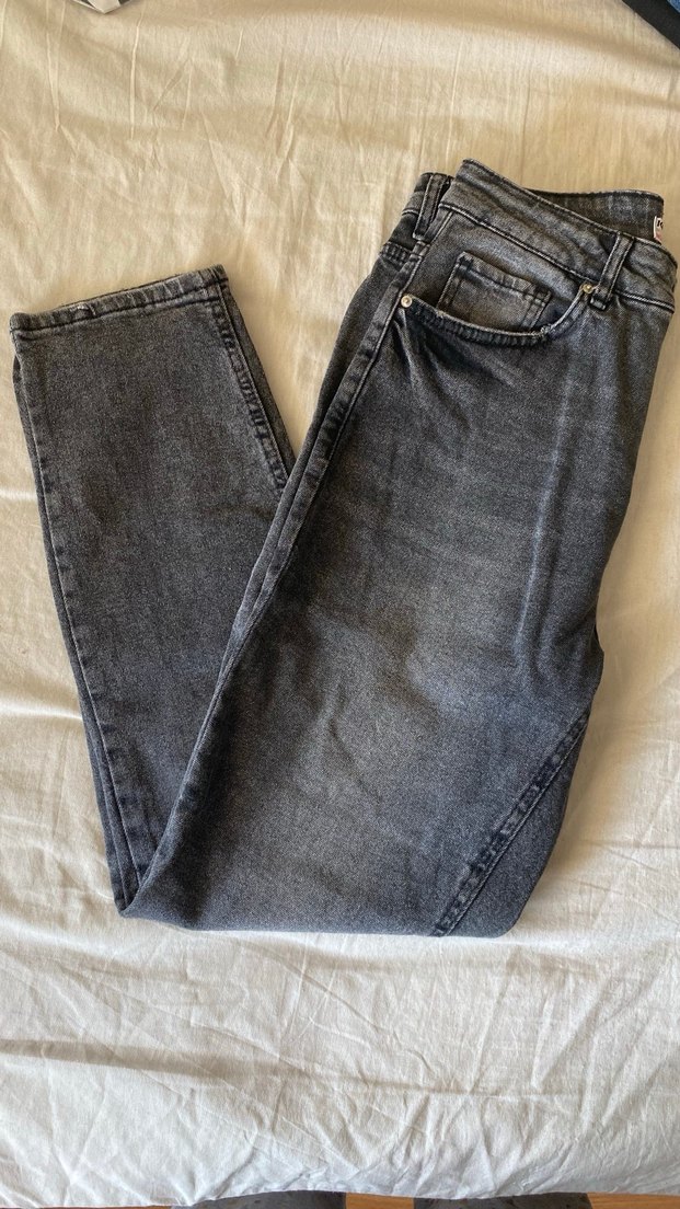 Gri renkte, salaş kesim ve normal midi boyda denim pantolon, gündelik kullanım için rahat ve zahmetsiz şıklık sunar.