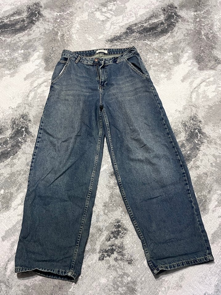 Denim kumaştan yapılmış, salaş kesim kadın kot pantolon. Günlük kullanıma uygun, rahat ve şık görünümlü.