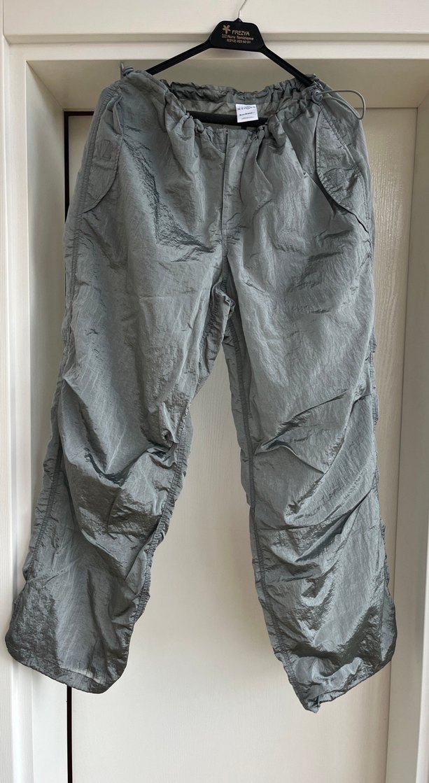 Urban Outfitters İets Frans Gri sentetik kumaştan yapılmış, salaş kesimli, drapeli midi uzunlukta rahat pantolon. İnce yağmurluk kumaşına benzer bir yapıda. Boy 100 cm.