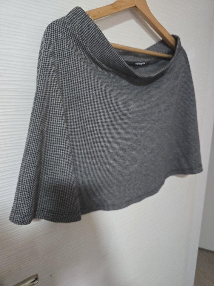 Salaş kesim, tek renk gri kadın pelerin. Yumuşak sentetik kumaştan, kayık yaka ve uzun kollu, günlük sokak stiline uygun drapeli tasarım.