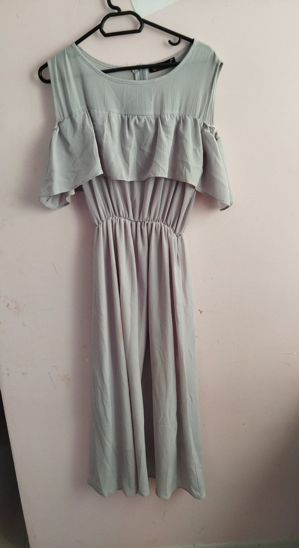 Gri renkli, salaş kesim uzun elbise. Kolsuz ve straplez yakaya sahip, yumuşak keten kumaştan üretilmiştir. Günlük kullanıma uygundur.