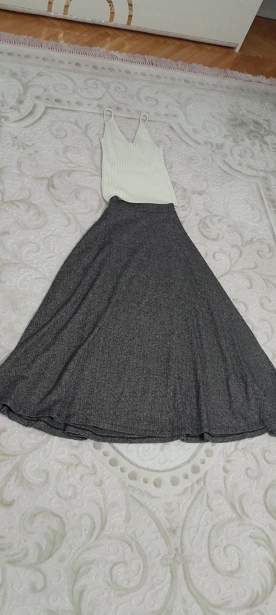 Gri renkte, salaş kesimli, drapeli uzun kadın etek. Yumuşak sentetik kumaştan yapılmıştır, günlük rahat kullanıma uygundur.