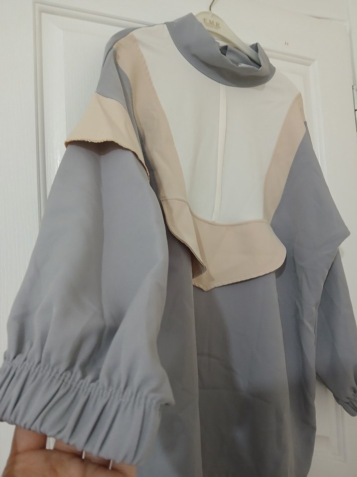 Yüksek yakalı, uzun kollu ve gri-bej tonlarında drapeli, salaş kesim hamile bluzu. Günlük sokak modasına uygun avant-garde tarzda.