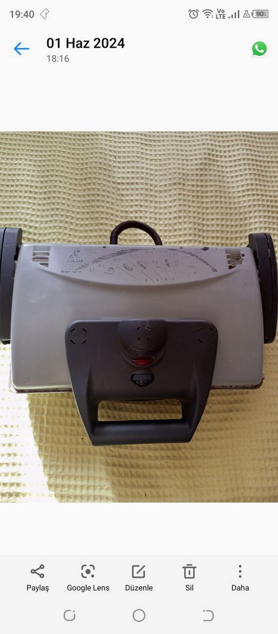 Gri renkte, tutma sapı ve gösterge ışığı bulunan kompakt sandviç ve tost makinesi. AKSU MARKA AZ KULLANILMIŞ