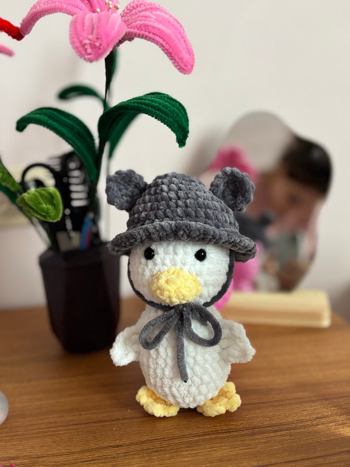 Yumuşak dokulu beyaz ve sarı peluş oyuncak ördek, gri örgü kulaklıklı şapka takıyor. Rahat ve sevimli görünüyor.