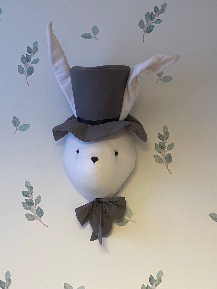 Yumuşak gri peluş materyalden yapılmış, uzun şapka ve fiyonk takmış tavşan başı duvar süsü. Ölçüler fotoğraflardır. Hiçbir defosu yoktur.