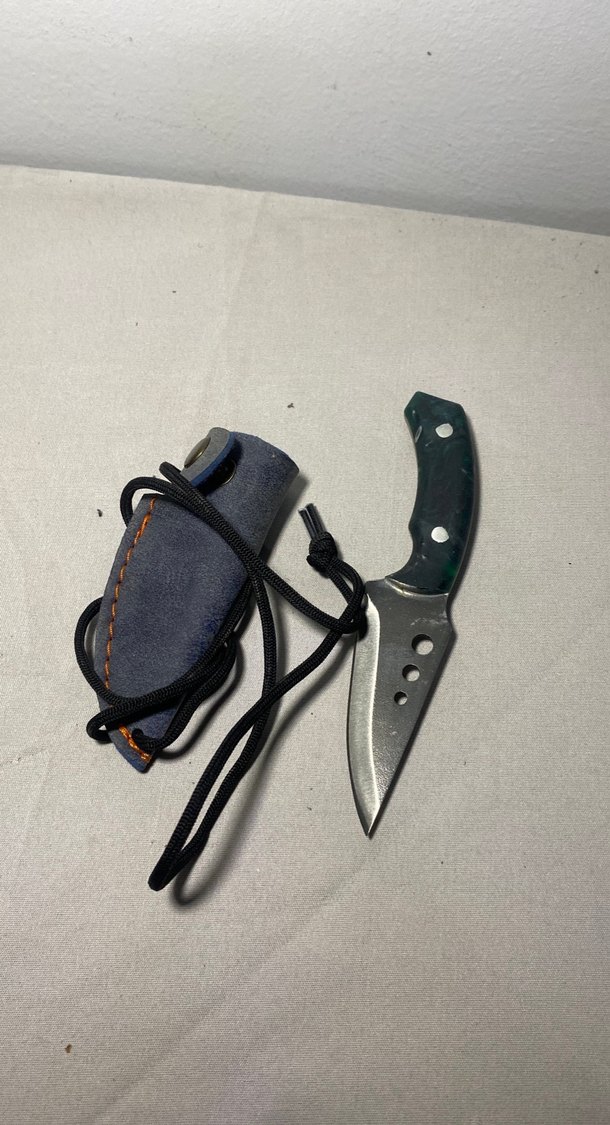 Gri saplı ve delikli küçük bıçak, koyu gri kılıf ve taşımak için ip ile birlikte gelir. Epoksi kabze kolye bıçak