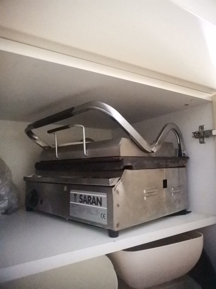 SARAN marka gri metal gövdesi ve büyük tutacağı olan tost makinesi, tost yapmak için kullanışlıdır.büfe ve kantin tarzı yerlerdeki makinelerle aynıdır. Döküm olduğu için oldukça ağırdır elden alınması daha uygundur yer İstanbul büyükçekmece dir