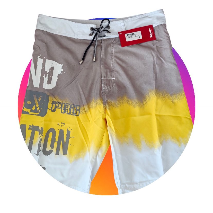 Gri ve sarı tonlarında batik desenli, bol kesim erkek şort, kemerli bel detayına sahip. Plaj için uygun şık bir seçenek.