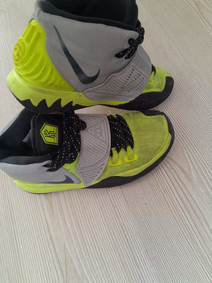 Gri ve neon sarı renklerde, baskılı detaylar ve fırfır süslemeye sahip Nike basketbol ayakkabısı. Kauçuk tabanlı, spor ve sokak stilini birleştirir.36.5 numara.