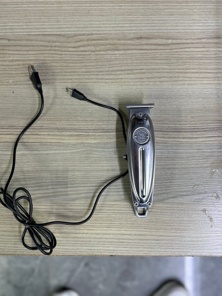 Gri renkte, şarjlı ve USB kablosuyla birlikte gelen metal gövdeli saç kesme makinesi. Kesimde hassasiyet sağlar. ✂️