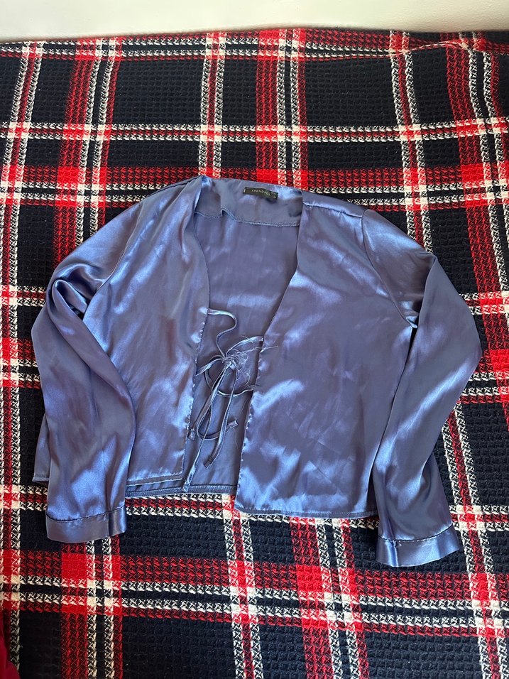 Gri renkli, saten dokulu kadın gömleği, uzun kollu ve bol kesimdir. Düğmeli ön kısmı ve notlu yaka detayıyla günlük sokak tarzına uygundur.