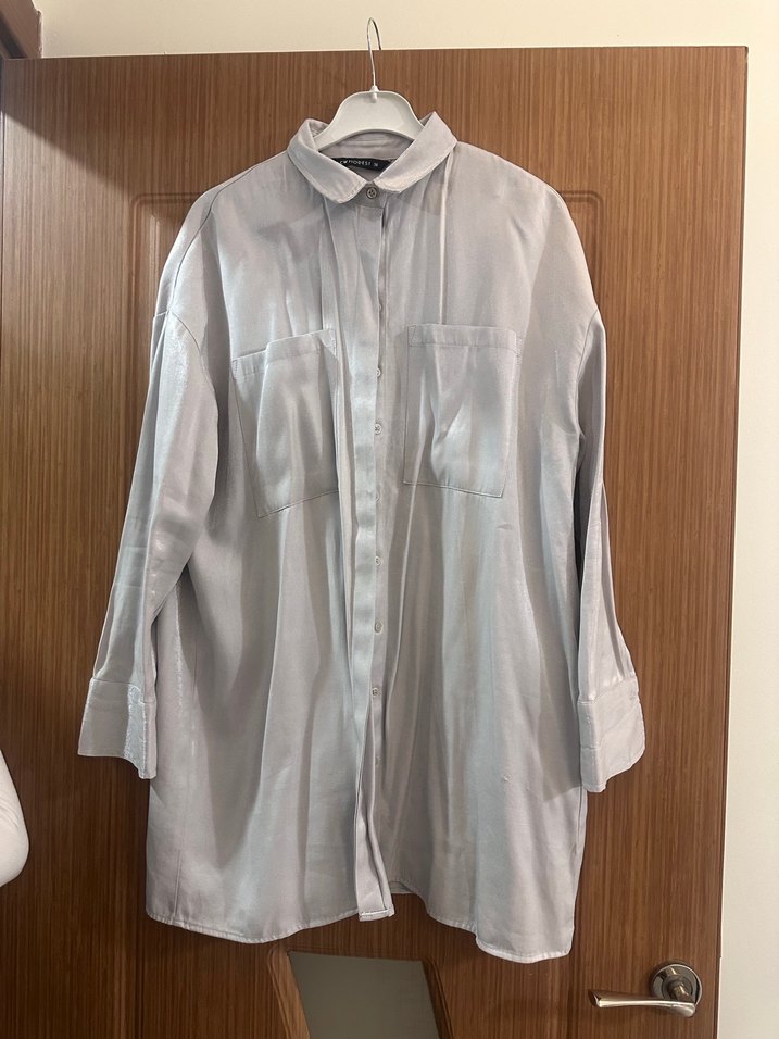 Kadınlar için saten kumaştan yapılmış, düğmeli ve yakalı, uzun kollu, bol kesim gömlek. Gri renkte ve midi uzunlukta, günlük kullanıma uygun minimal ve trend stil.