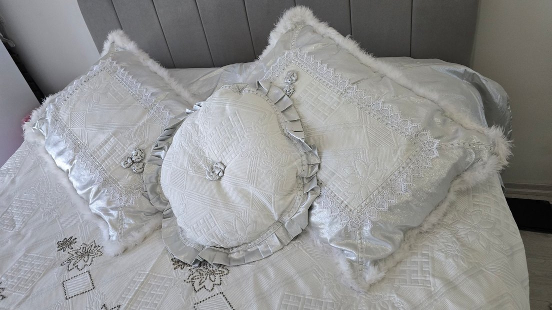 El işi Gri saten fırfırlı, beyaz nakışlı yastık kılıfı, yumuşak dokulu ve dekoratif detaylara sahip. ✨
