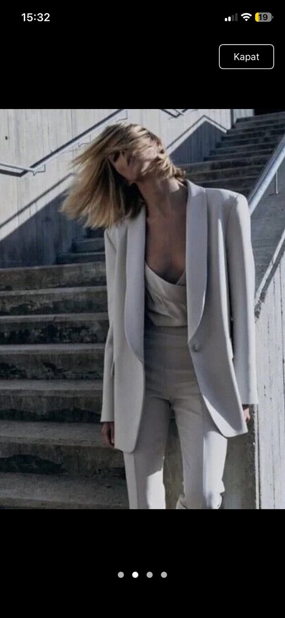 Gri saten kumaştan yapılmış, yakalı ve düğmeli kadın blazer ceket. Normal midi boy ve rahat kesime sahip, ofis ve sokak modasına uygun Zara markası.