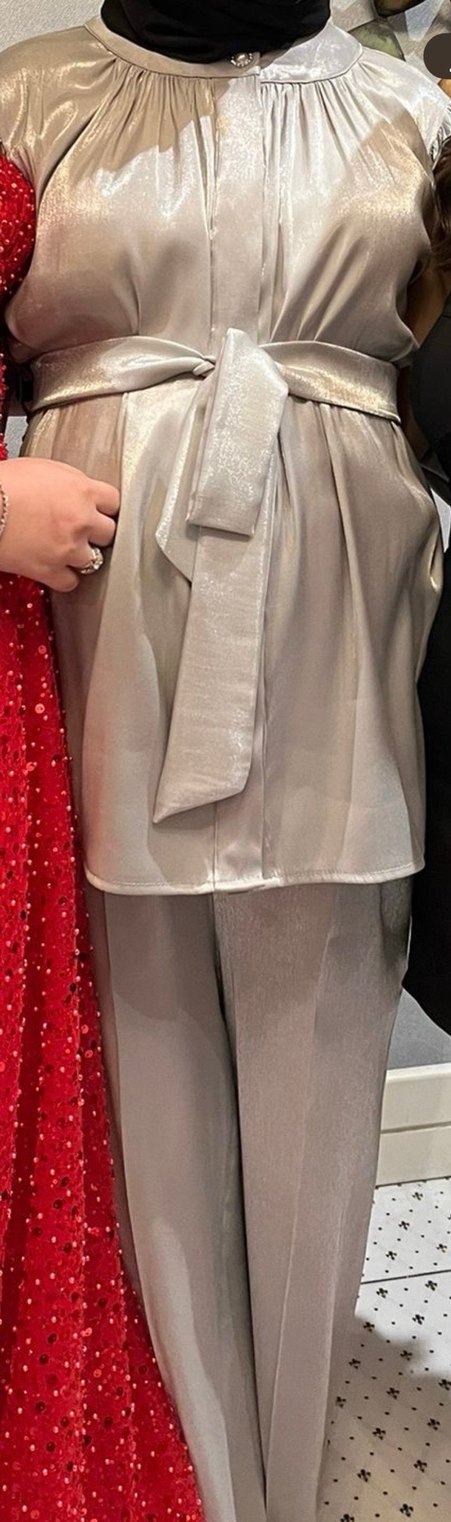 Gri saten midi uzunlukta, bol kesim hamile bluzu. Drapeli halter yakalı, askılı kollu ve desensizdir. Modern düğünler için uygundur. Kendinden sinli 38/ 40/42/44 uyumlu