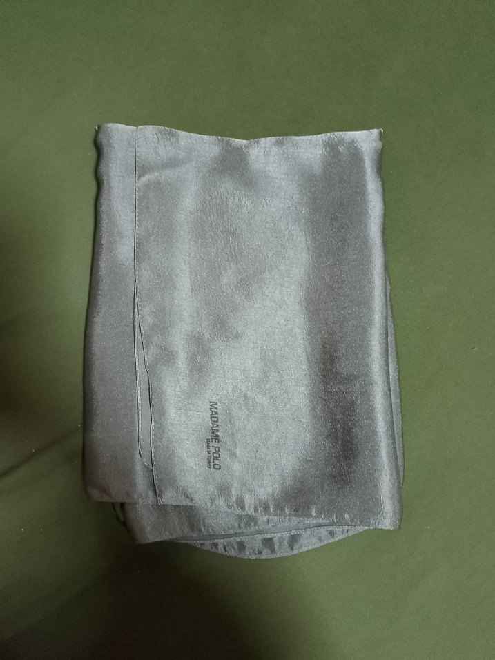 Gri renkte, saten dokulu kadın şal, minimal ve normcore tarzda sade ve şık bir görünüm sunar. bir taraf parlak bi tarafı mat