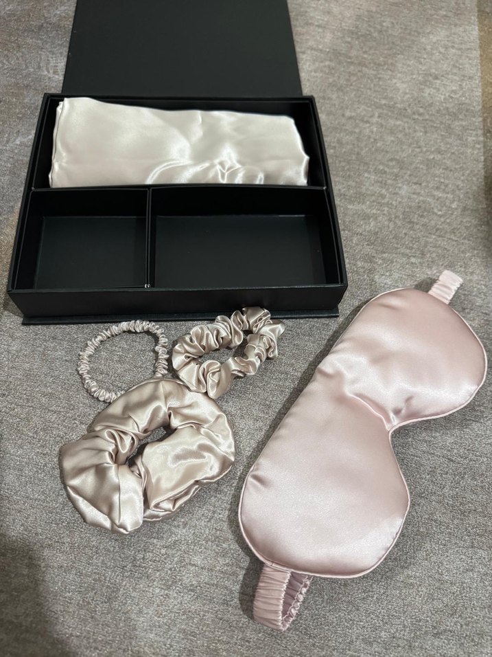 Gri saten uyku maskesi ve uyumlu saç tokalarından oluşan set, çağdaş ve zahmetsiz şıklık sunar. Rahat uyku için idealdir.