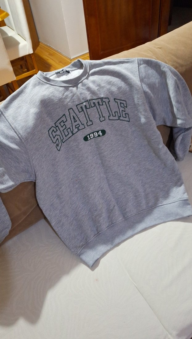 Gri, bisiklet yaka, uzun kollu, bol kesim ve örme kumaştan sweatshirt. Üzerinde "Seattle 1994" baskısı vardır. ️