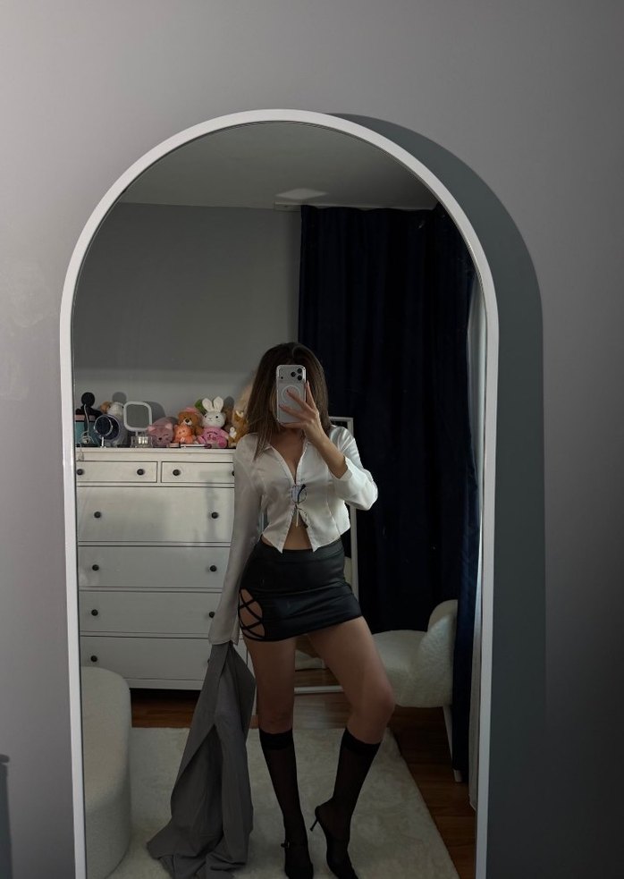 Bu dar kesim gri deri mini etek, şeffaf yan detaylara sahip olup, ofis için uygun cesur gotik bir tarz sunar.