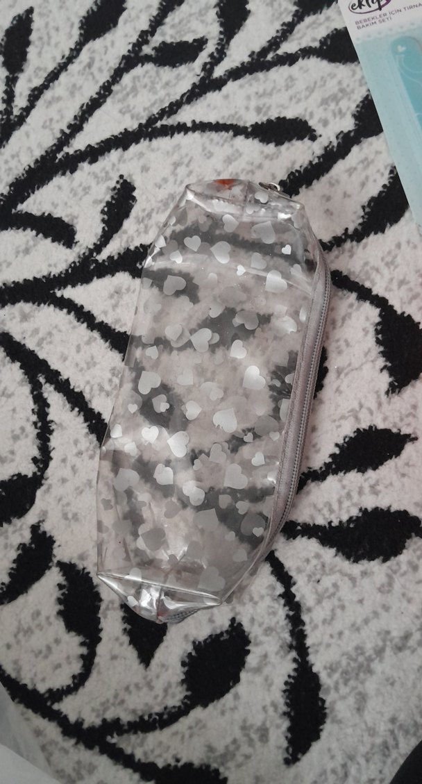 Şeffaf gri plastikten yapılmış, kalp desenli ve fermuarlı makyaj çantası. Günlük kullanıma uygun, minimalist ve modaya uygun tarzda.