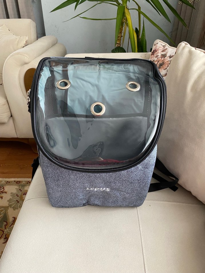 Üstü şeffaf ve havalandırma delikli gri evcil hayvan taşıma çantası, küçük hayvanların rahat ve güvenli taşınması için uygundur.
