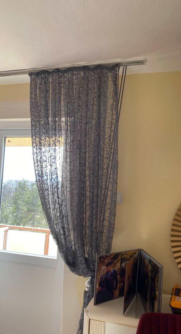 Gri renkte, modern tarzda, hafif ve şeffaf kumaştan yapılmış perde, odaya yumuşak ışık sağlar ve hafif doku katar. ️