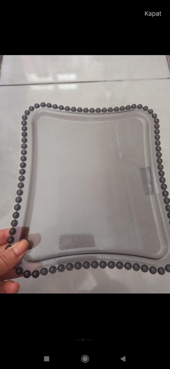 Gri boncuklu kenarlara sahip şeffaf sunum tepsisi kullanımı için sade ve işlevsel bir yüzey sunar. ️