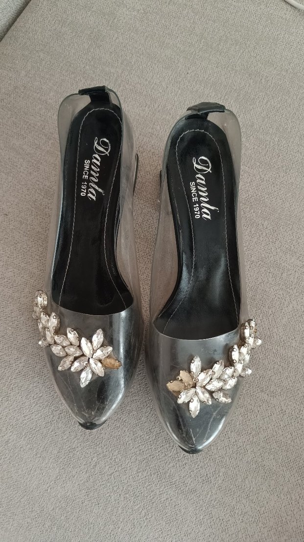 Damla markalı, gri renkli, sequins detaylı ve desenli, kauçuk malzemeden yapılmış yüksek topuklu kadın abiye ayakkabı. Düğün için uygun. 3 taşı düşmüş