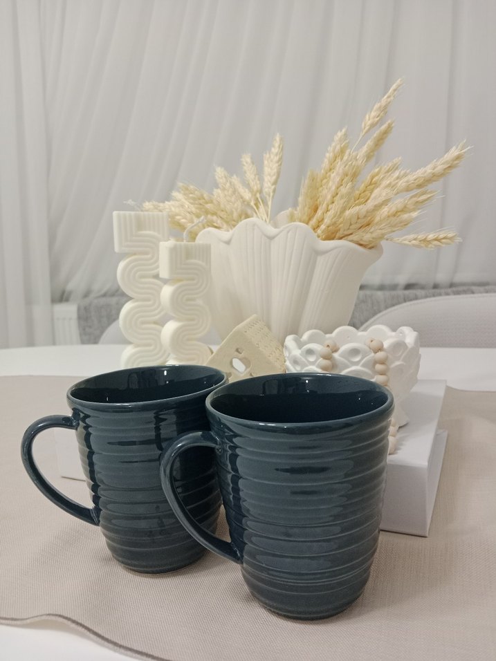 İki adet gri seramik, çizgili dokulu kupa seti, sıcak içecekler için uygundur. ☕ toplam 6 adettir