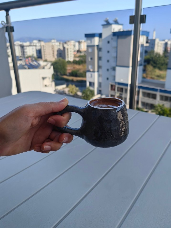 Kulplu, gri kaya görünümlü seramik kahve fincanı. Pürüzsüz yüzeyi ve nötr rengiyle kahve severler için kullanışlıdır. El yapımı gıdayla temasa uygun sırlıdır. ☕