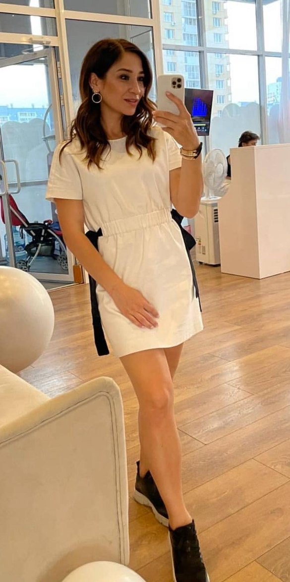 Bu beyaz kısa kollu, yuvarlak yakalı ve bol kesimdir. Midi boyda, gri yan şeritlere ve kolay giyim için arkada fermuara sahiptir.