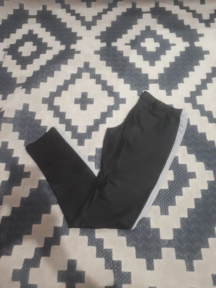 Siyah, gri şeritli, yapışkan bant detaylı, sentetik kumaştan yapılmış, spor ve günlük kullanım için uygun kadın taytı.