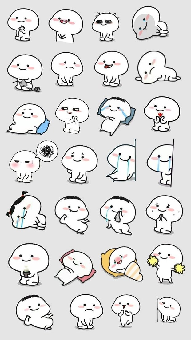 Farklı duyguları ve hareketleri gösteren gri sevimli animasyon figürleri seti. Yumuşak, açık gri tonlarda ve ifadeli yüz özelliklerine sahip. Koleksiyon veya dekorasyon için uygun. Sticker