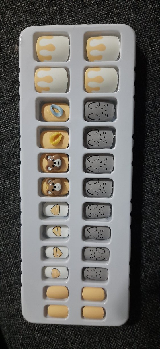 Gri renkte, ayı, kedi ve kek desenli sevimli tırnak süslemeleri seti.