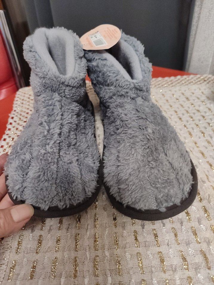 Gri renkli, yumuşak ve sıcak kumaş, kürk detayları ve işleme desenlerle rahat ve şık bir görünüm sunar.