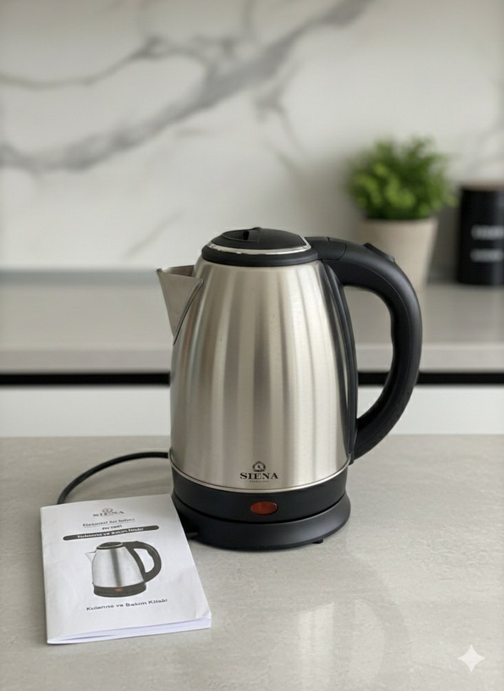 Gri Siena elektrikli su ısıtıcısı, paslanmaz çelik gövde ve siyah tutma sapına sahiptir. Güç göstergesi ışığı ve çıkarılabilir kablo ile kullanışlıdır.