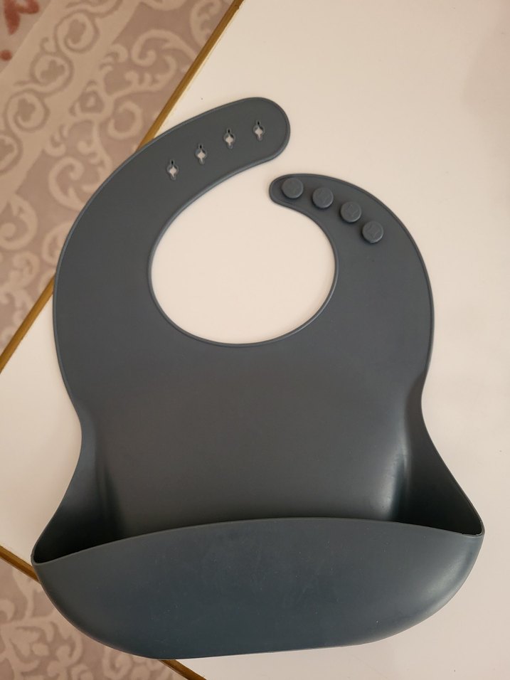 Ayarlanabilir boyun kısmı ve geniş cep içeren gri silikon bebek önlüğü, döküntüleri toplar ve kolay temizlenir.