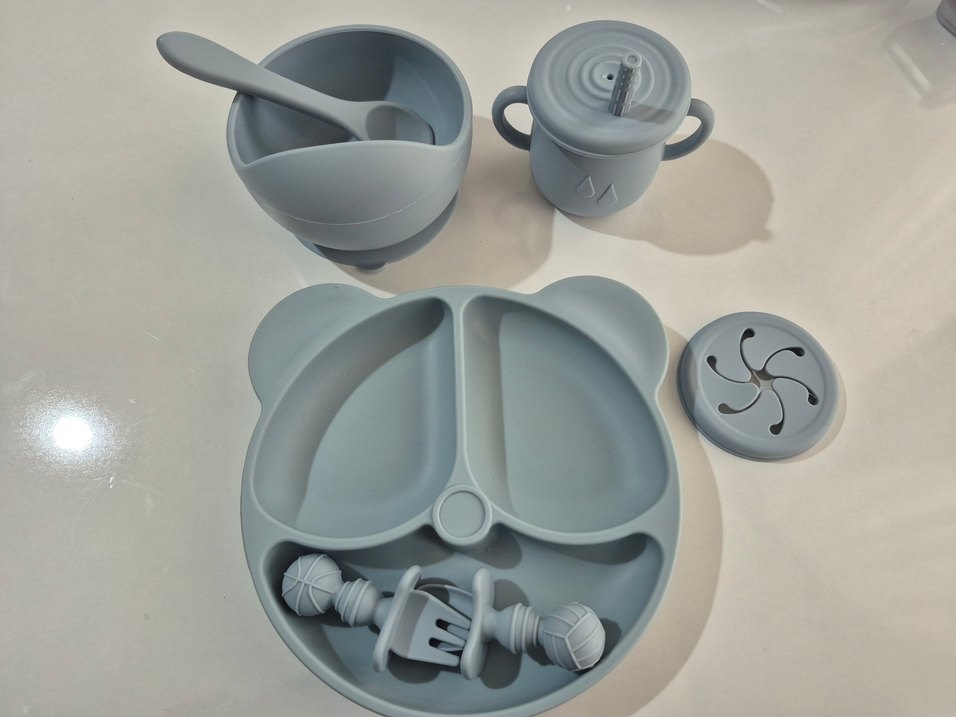 Gri silikon malzemeden yapılmış, ayı şekilli bölmeli tabak, çatal, bıçak ve kulplu pipetli bardak seti 6 parça +2kapak