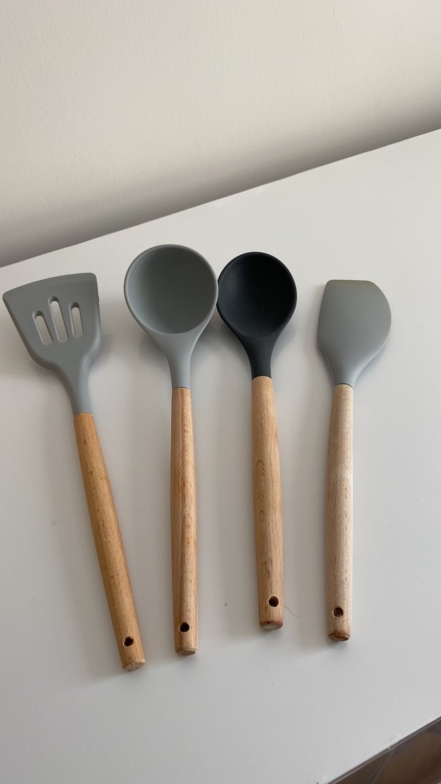 Gri Silikon ve Ahşap Saplı Mutfak Gereçleri Seti
