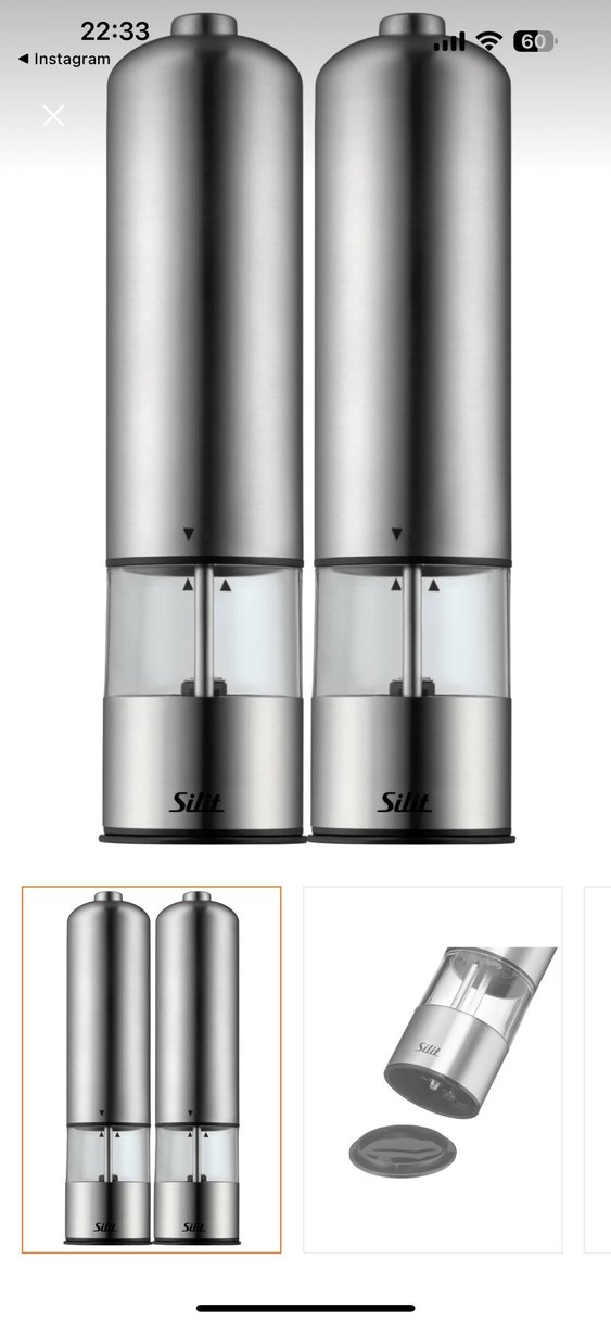 Silit markasına ait gri renkli, metal ve şeffaf malzemeden yapılmış tuz ve karabiber değirmeni setidir. Ayarlanabilir öğütme özelliği bulunur.